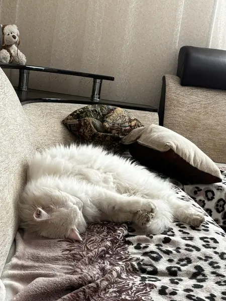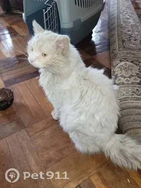 Кот ласковый, по поведению похож на домашнего (ходит в лоток). Не кастрирован. Глаза желтые. Пушистый, белый, имеются рыжие пятна на лапках. Весь в колтунах и чумазый, отсутствует несколько зубов, есть следы повреждений от отвалившихся колтунов, слегка повреждены веки (чуть отёкшие), конъюктивит. Вес 4.30 кг. Примерный возраст 3 года.