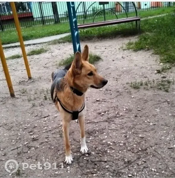 Собака рыжая с чёрной спинкой, худая. На ней одеты ошейник и шлейка. Находилась на детской площадке между домами 21 и 25 по улице Фадеева город Балашиха (мкр.Южный). Собака умная, добрая, ласковая,знает команды.Пытается залезть в останавливающиеся на остановках автобусы. Ищет хозяина в магазинах с лестницей и самооткрывающимися дверями. Временно приютили у себя, но долго держать не можем (у ребенка началась аллергия). Просим откликнуться хозяина или неравнодушных людей, которые могли бы её забрать себе.