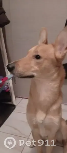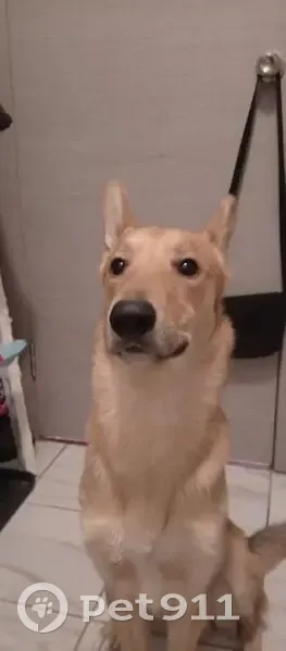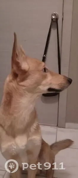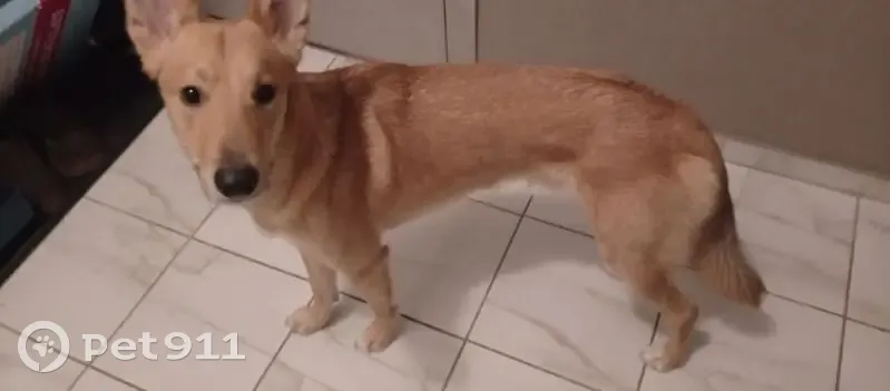 Рыжеватая собака, мальчик, был найден с ошейником желтого цвета. Знает несколько команд, к другим собакам настроен не агрессивно.