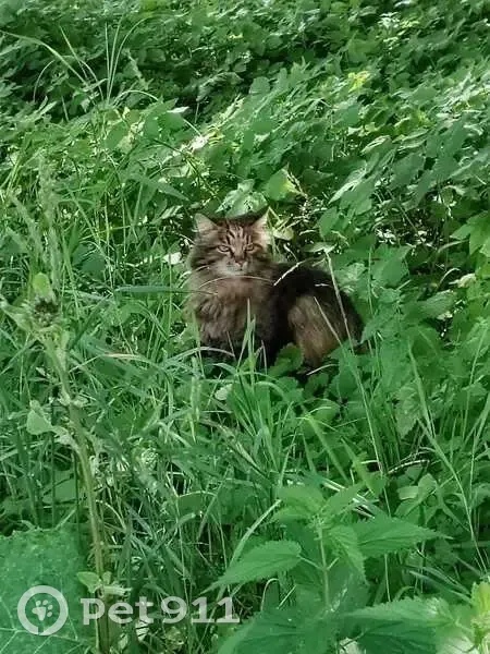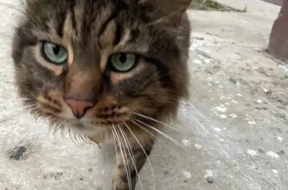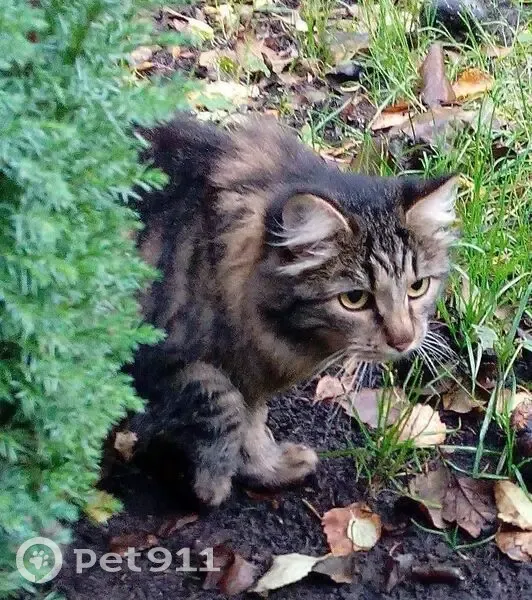 Кошечка очень пушистая, табби (дикого) окраса с вырозительной мордочкой, ушки внутри пушистые, не крупного размера, по спинке спускается широкая тёмная полоса, может быть напуганная и похудевшая.