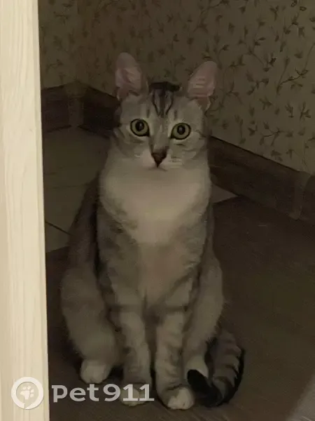 Предположительно выпрыгнул с балкона. Окрас сероватый в полоску, на хвосте и лапах особенно ярко выражены. На грудке и животе шерсть белая. Без ошейника. Зовут Каспер. Важная особенность: на задних лапках стерта немного шерсть, выглядит как проплешина.