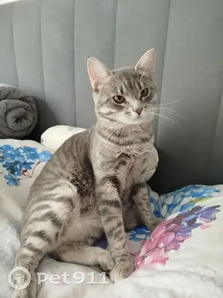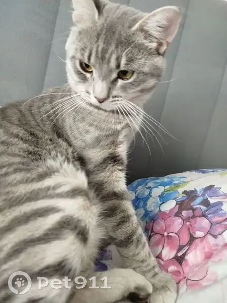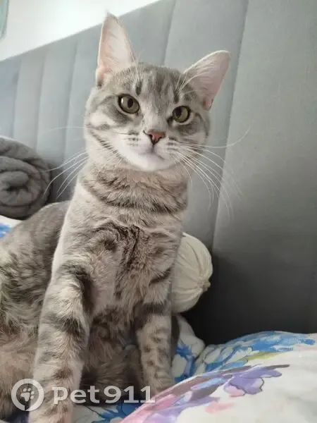 Серый, в тëмную полоску. Прыгнул с первого этажа. Нет пятен ассиметричных все полоски симметричны, белые пятнышки где усы. Живот пушистый тегровый и хвост пушистый. Очень умный отзывается разговаривает но боится человека обычно и собак очень боится