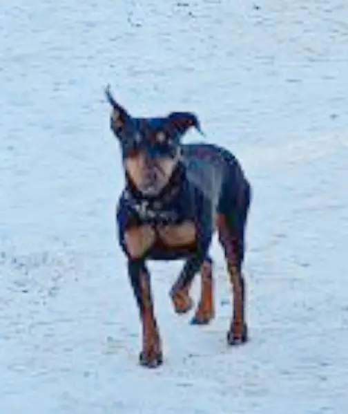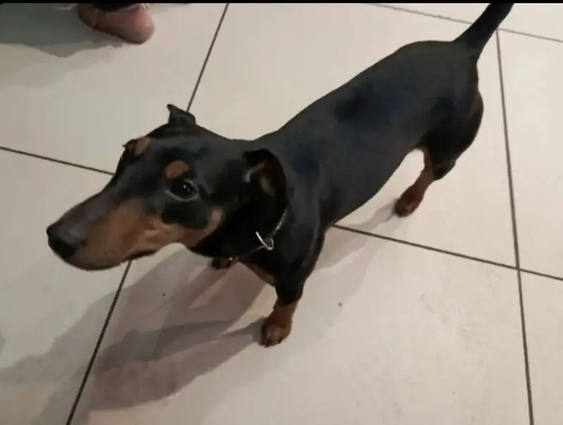 Черная белой грудкой. Помесь таксы с пикинесом. Была привязана возле ларька хот-догов на парковке магазина магнит