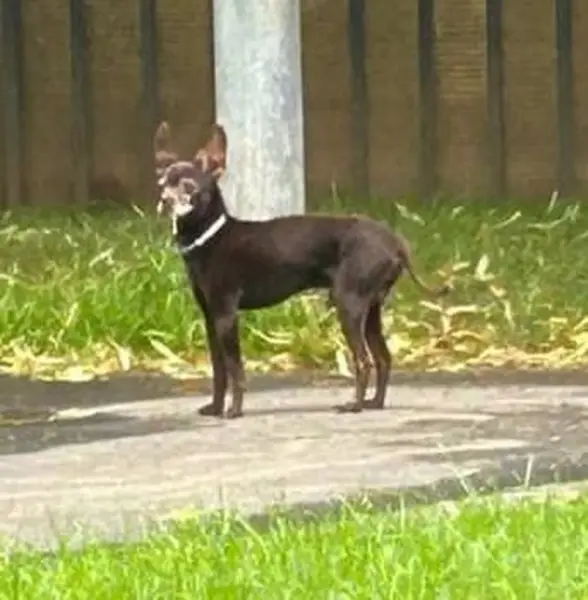 Порода русский той-терьер Потерялся скорее всего на южке, рядом с твардовского, не мог далеко убежать. Мальчик, откликается и зовут его Гуча, у него есть клеймо, окрас черный с коричневым подпалом