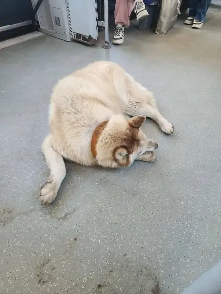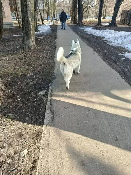 Пёс лайка по кличке Арчи. Белый с рыжеватой спинкой, хвост в крючке темный. Рост в холке 55-60 см