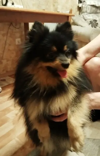 Черный одноглазый шпиц, мальчик, на нем была черная шлейка, зовут Мишка, вышли из машины такси без поводка, он заигрался с другой собакой и убежал за ней, потерялся среди дворов поздним вечером.