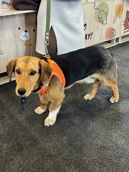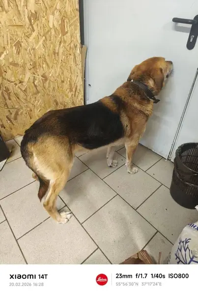 Джессика белая грудка коричневый окрас. Девочка. Ошейник поводок. Пугливая.