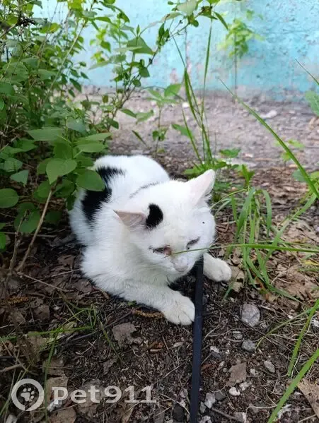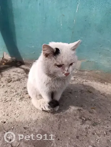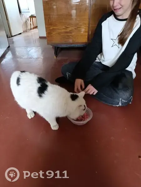 Белый с чёрными пятнами, не кастрирован, примерно 5-6 лет, по виду уличный, добрый ласковый,ручной не царапается, не кусается. Отсутствуют верхние клыки, здоров, но видно, что участвовал в драках.