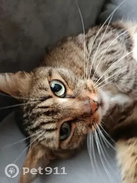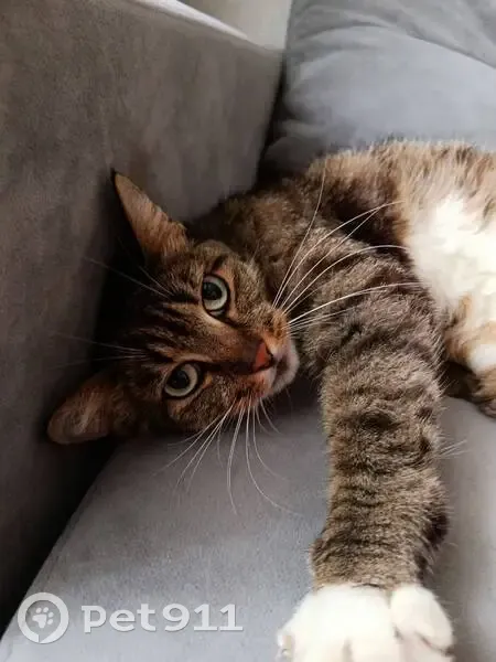 Серо-коричневый окрас с чёрным. На грудке былый фартучек и на лапках белые носочки. Нашли 2.08.25 вечером возле остановки "Пушкина", сидел под деревом и плакал.