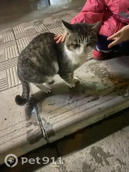 Возле бывшей хорошки сидит котик или кошка. Очень ласковый. Видно, что замерз. Скорее всего потерялось животное. Окрас белый с камышовым. Не крупного телосложения