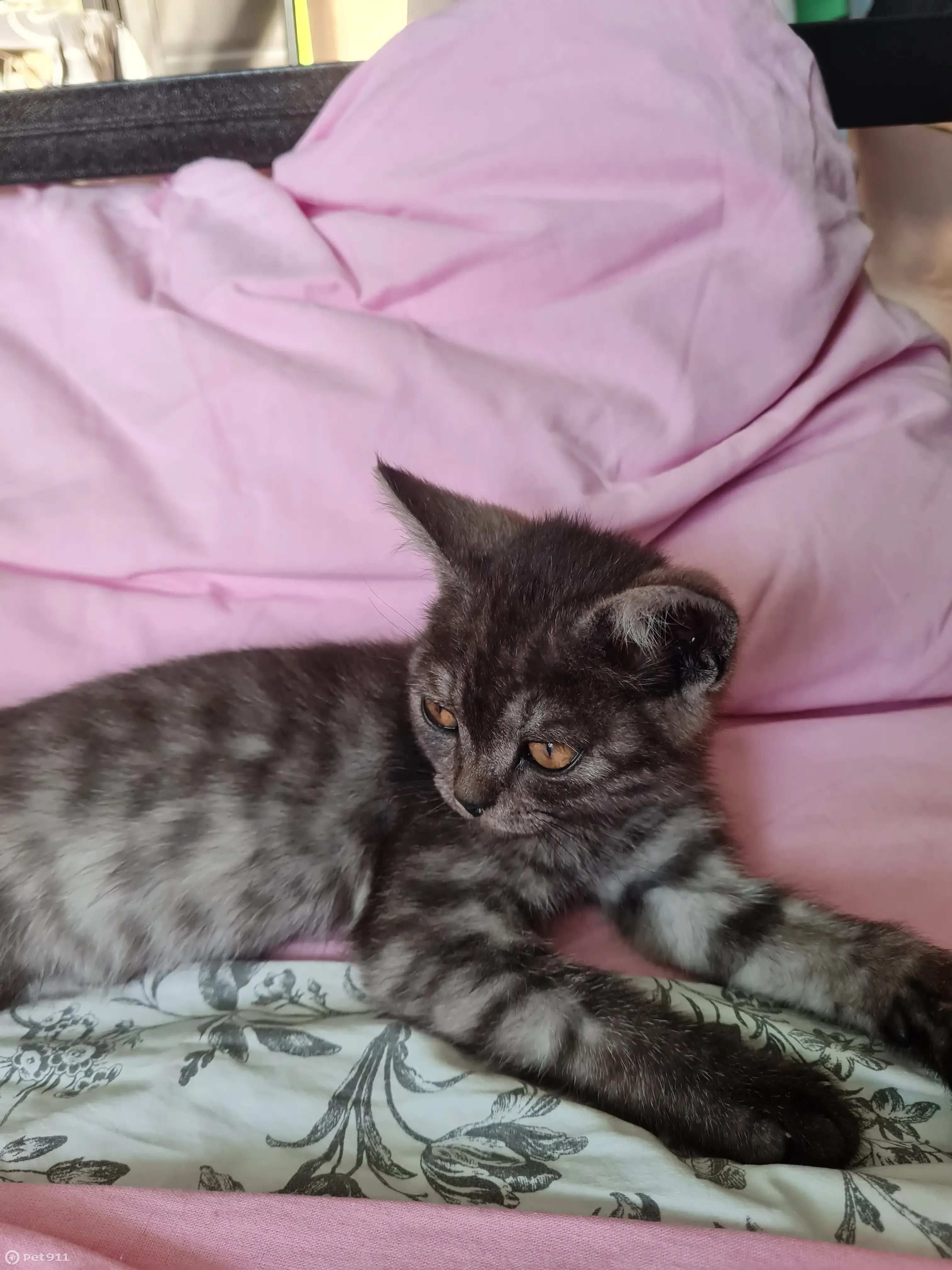 Котенок 3- 3.5 месяца, девочка пепельного цвета со светлыми полосками. Была найдена по крику, бегала по улицам, заборам, деревьям, но ни в одни ворота не зашла. Увязалась за нами, не хотела оставаться одна. Забрали на передержку. Есть вероятность, что потерялась. Выглядит ухоженно, но была очень голодной