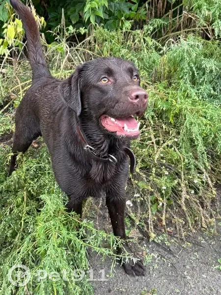 шоколадный лабрадор (?) после грома прибежал на улицу и начал играть с детьми. Видно что еще маленький, примерно 1-2 года. На ошейнике адресника не нашли. Оставили у себя на передержке
