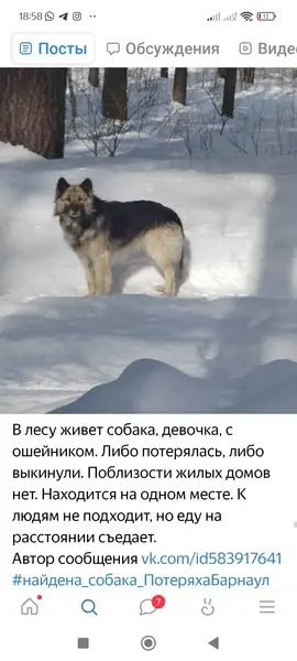 Молодая овчарка 6 месяцев. Нашли 08.12.2025 рано утром в районе трамвайной депо на Коммунаров. Бегала по проезжей части, создавая аварийную ситуацию. Привязалась к мужу и пришла к нам и не уходит. Кормим и ждём хозяина. Тел. 89132560278, 89836057755