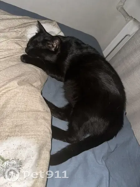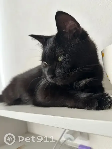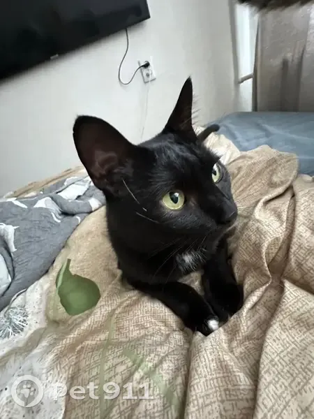 Чёрная гладкая шерсть, маленькое белое пятно на груди, под левой подмышкой, на пальчиках передних лап и белые пятна на подушечках лап, зелёно-жёлтые глаза, кастрирован