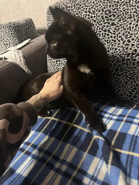 черный кот, с белым галстуком на шее, зеленые глаза вышел через открытое окно первого этажа
