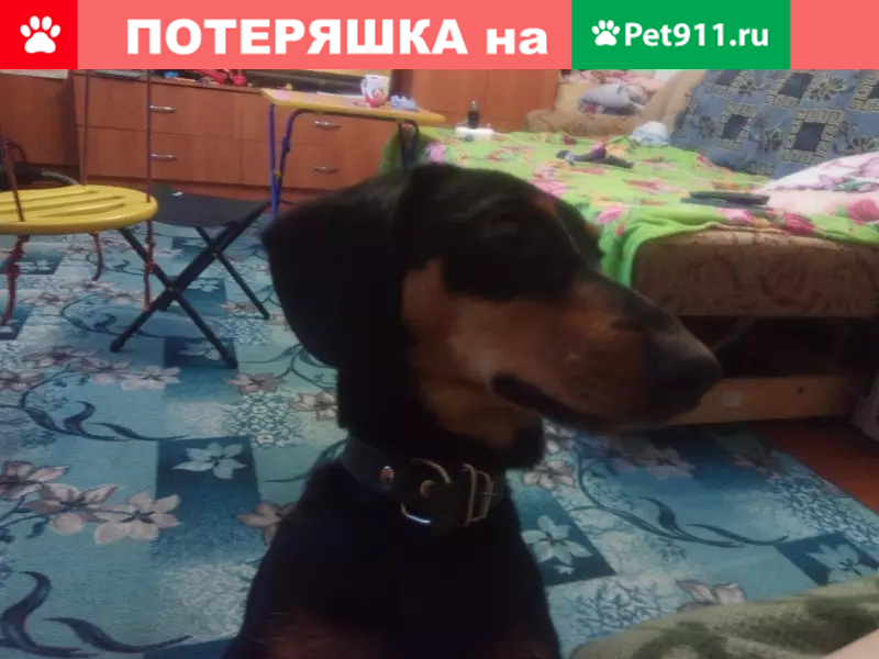 Такса, кобель, 2 года. Цвет черно-коричневый, на груди белое пятно. Ошейник брезентовый, болотного цвета. Кличка Зевс. Пропал 11 августа в п. Новые Зори, Алтайского края, недалеко от г. Барнаула.