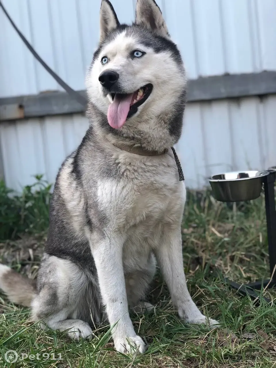 Хаски, сука, небольшого размера - можно спутать с полугодовалым/годовалым щенком. Окрас черно-бело-серый, с преобладанием белого, лапы белые, хвост не завернут в трубку. Глаза голубые. Без ошейника.