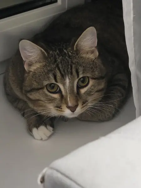 Котик, серый в полоску с белой морковкой и лапками гуляет по поселку