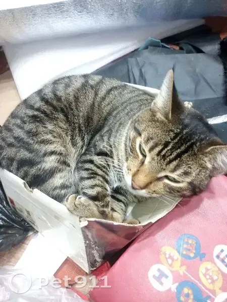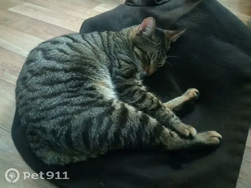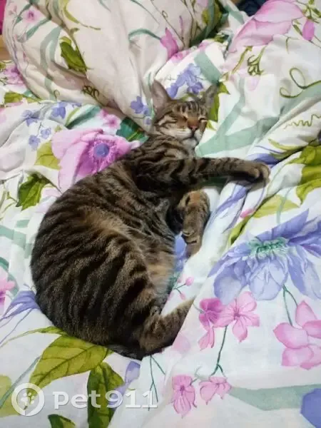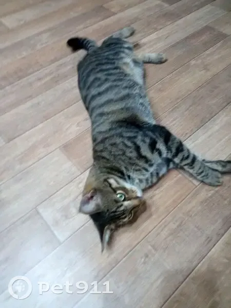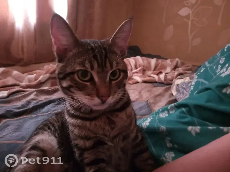 Возраст 3 года. Кастрированный. Крупный, короткошерстный серый в чёрную полоску, на мордочке и животе рыжина. Глаза большие миндалевидные зелёные. Одно ухо немного надорвано. На правом плече шерсть была выбрита после операции, сейчас уже немного отрасла. Пропал вечером 15 мая из двора частного дома.