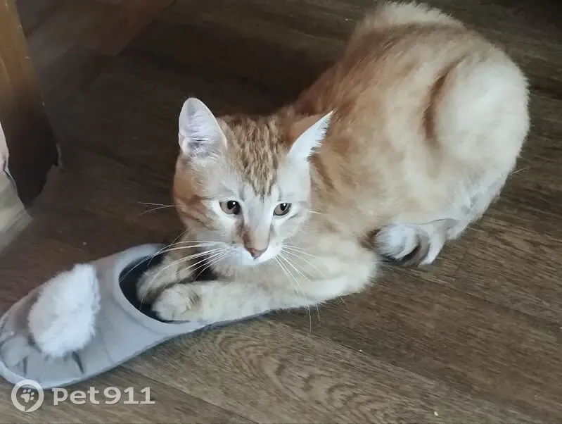 Рыжий с белым и тёмнымо рыжими полосками, подстриженный, карие глаза, с виду худенький, карие глаза, на попе осталось не большое зелёное пятно от зелёнки, на носу пятнышко. Мог сильно испугаться и побежать в неизвестном направлении, к чужим относится с подозрением и мог испугаться