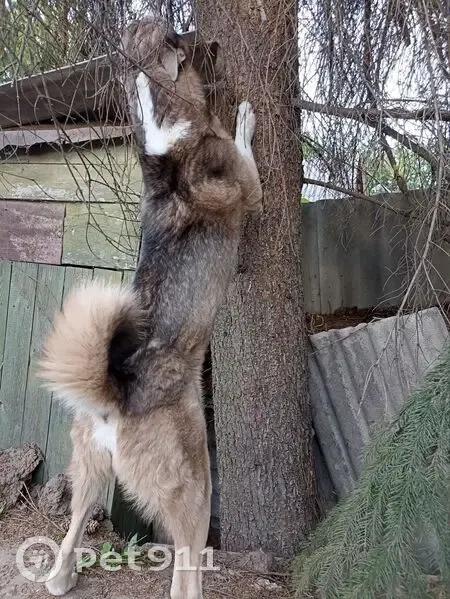 Западно-сибирская лайка. Окрас зонарно-рыжий (бежевый с тёмной полосой вдоль спины, белым вытянутым пятном на холке, белыми "носочками" на лапах, белый кончик хвоста). Глаза серо-голубые. Хвост калачиком. Выбежал со двора частного дома, был без ошейника.