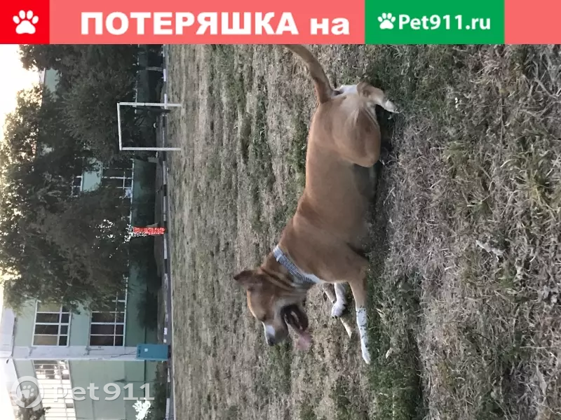 Светло кор чревный окрас, с белым пятном на груди. На шее чёрный ошейник с шипами, отзывается на кличку АЛЬФА. Трусливая, безобидная, потерялась в районе парка Гагарина, где то в 19:30
