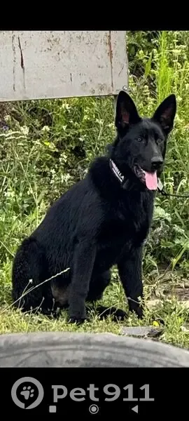 Чисто чёрный окрас. Молодая девочка 8 мес. Характер покладистый. На ней был шеврон с надписью не гладить не трогать. Чёрный ошейник с металлическим кольцом