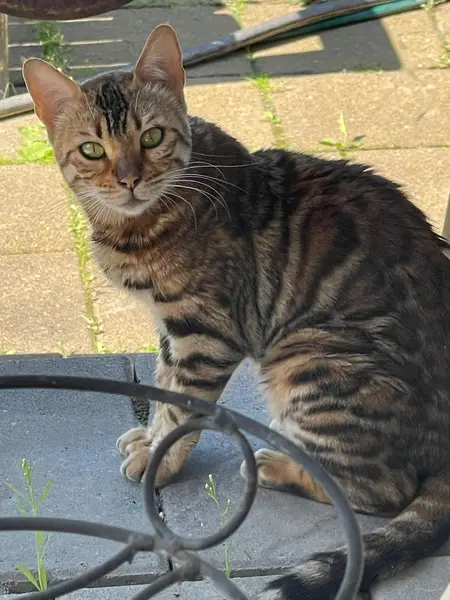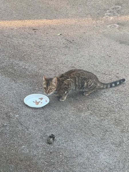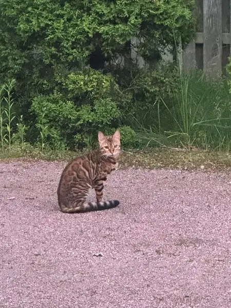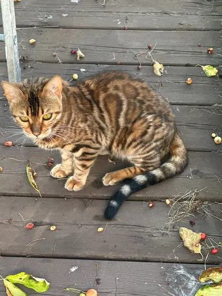 Порода Бенгал, тигровый окрас. Очень спокойная. Живет в п.Песочный, на самовыгуле. Вчера случайно забралась в газель, водитель уехал и только на развязке Белоостров-ЗСД услышал что она шкребется. Остановился, открыл кабину, кошка выпрыгнула и убежала.