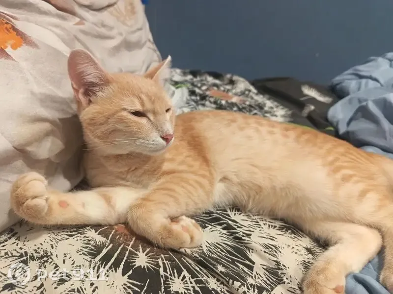 Окрас бежевый (рыжеватый), с белыми полосками на мордочке и рыжими полосками на теле, нос сердечко, длинное тело, зеленоватые глаза, большие уши. Пугливый, быстро бегает, хороший прыгун, хорошо умеет прятаться