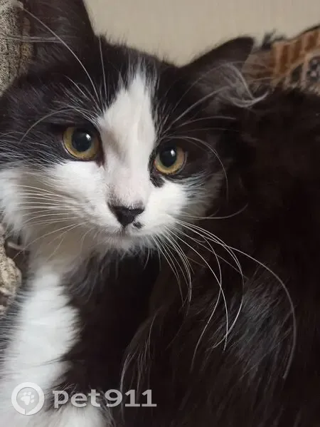Черно-белая пушистая кошечка Поньо, пушистый хвост, "родинка" возле носа, глаза зеленые (на фото желтые, недавно цвет изменился) на животе зеленое пятно после операции (стерелизации). Пропала в частном секторе улиц Ленина-Московская в вечернее время