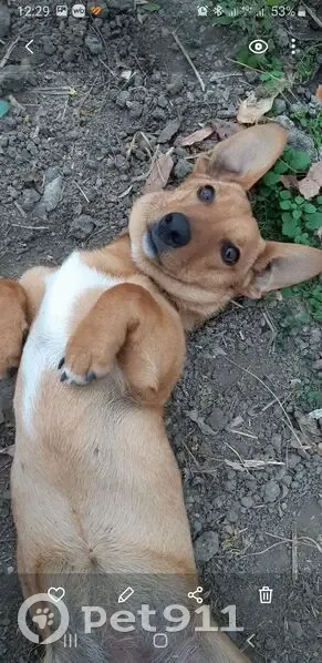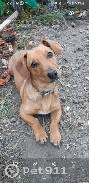 Рыжая, небольшая, помесь таксы с дворняжкой, похожа на таксу, на груди, между передними лапами белое пятно, на шее был ошейник светло оранжевого цвета.. Была гроза, Леська её очень боится и, каким-то образом убежала со двора.