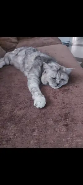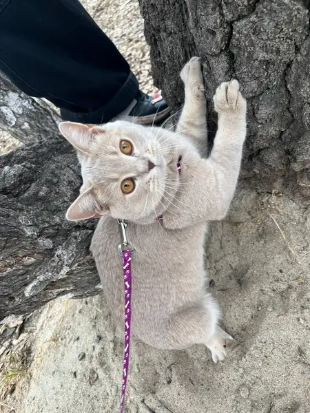 Кошка бело-серая с черным носиком, хвостик полосатый