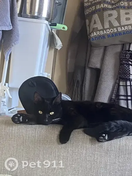 Черный окрас, только на груди белая точка. Если смотреть близко проглядываться полоски светло черные. У основания хвоста ранее сбривали шерсть и она отличается длиной. Возможно вывезли в город (есть возможность)
