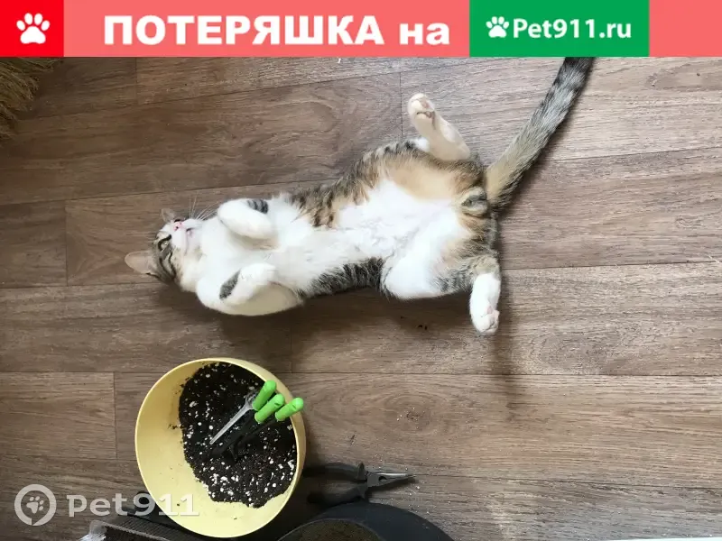 Кот Сёма , Семён. Возраст около года. Не кастрирован. Окрас - белый, серый, коричневый. На спине пятнышки серо коричневые. Мордочка с красивыми разводами на щеках и лобике. Розовый нос. Шея и живот белые. Глаза большие, взгляд внимательный и немного глуповатый. Ласковый, но к чужим людям в руки может не идти! Пропал в Московской области, дмитровский район, посёлок Благовещенское -2