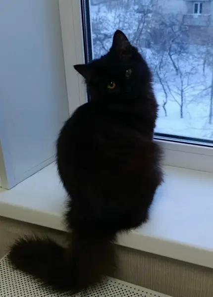 На кончике правого уха белая шерсть, длинношерстная, с оранжевыми глазами, девочка