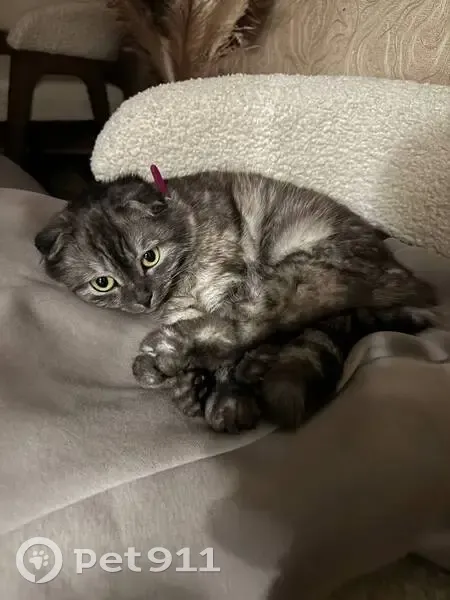 Пропала кошечка Стэфа (Стеша) В районе водоканала, жил-управления Шотландка, вислоухая Темно-серая полосатая, подшерсток белый Пугливая Не мяукает, только пищит Ошейник розовый с сердечком Когда сидит поджимает одну из передних лапок Есть курдючок Просьба, если встретите призадержать ее Хозяева переживают
