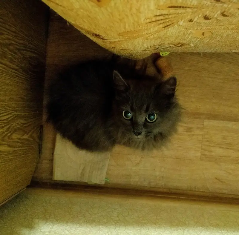 Крупный,с большими оранжевыми глазами,диковатый потому что не уличный,ходит на полусогнутых.Может забиться в сараи, подъезды.