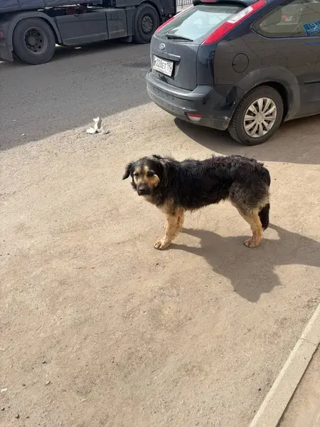 Овчарка. Черная спинка, темная мордочка, основной окрас рыжеватый. Шерсть длинная. На передних лапках шерсть как юбочка лапки прикрывает. Коричневый ошейник. Очень осторожный, к рукам не пойдет.Глазки карие.