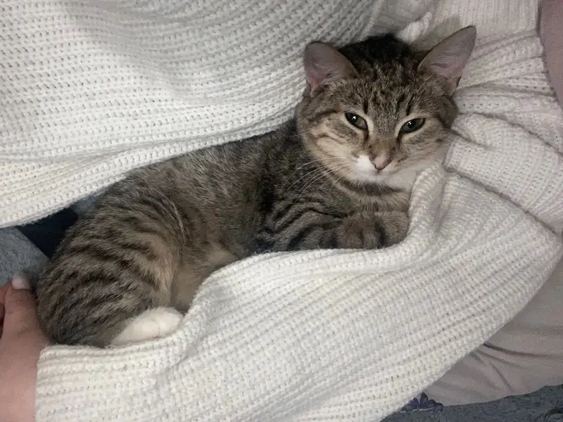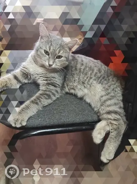 Серо-белый, в полоску, шерсть набитая, домашний потеряшка,очень ласковый, любит присутствие человека, ест корм и ходит только в лоток, на вид молодой до года, в местной группе никто не откликнулся.