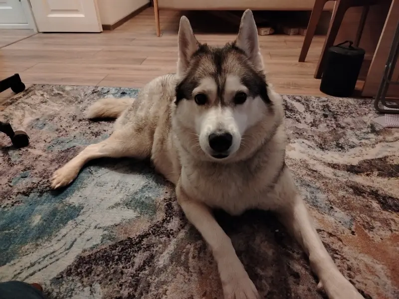 Порода маламут, зеленый плотный тканевый ошейник, на животе большой шрам (стерилизованная). Глаза светло-коричневого орехового цвета. Утром сбежала из дома через калитку соседей (дети не закрыли)