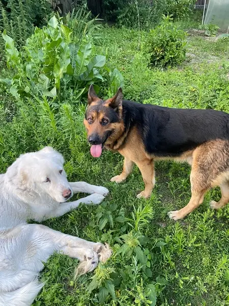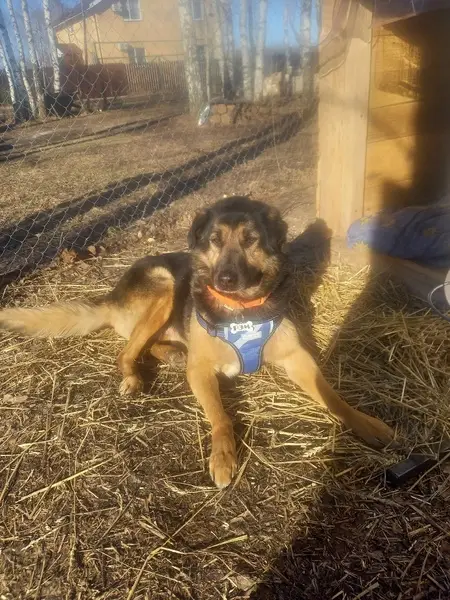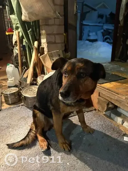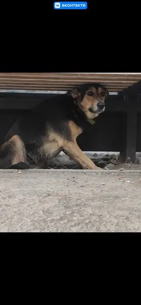 Среднего размера. Окрас чёрно-рыжий, короткая шерсть. Уши полустоячие, хвост средней длины. Очень добрый, спокойный, может быть напуган, к людям относится доверчиво. Задние лапы слабые. Красный ошейник Встретили ее 1 января примерно 20:00, в парке 70 лет Победы и она пошла за нами и никуда не уходит.