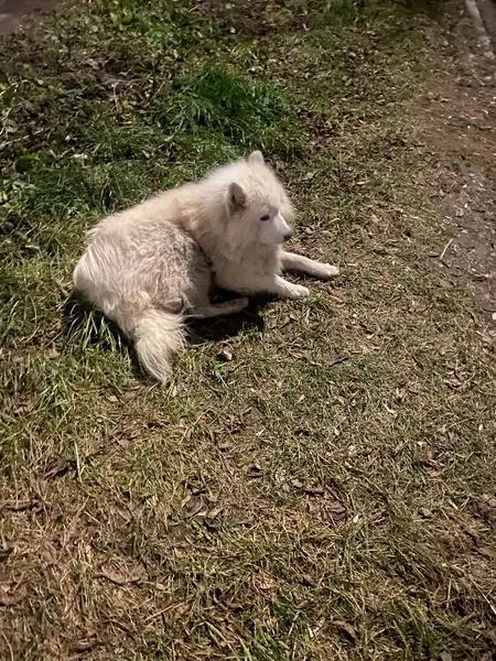 Самоед, сука, ошейник цвета хаки, информация на нем отсутствует, чипа не нашли, очень умная и воспитанная. НСобака замёрзла, сидела на дороге между деревней Ивановское и Мякотинское.