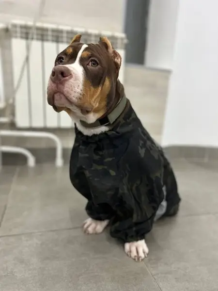 По всей видимости стафф, с поводком черно красного цвета и ошейником из брезента.
