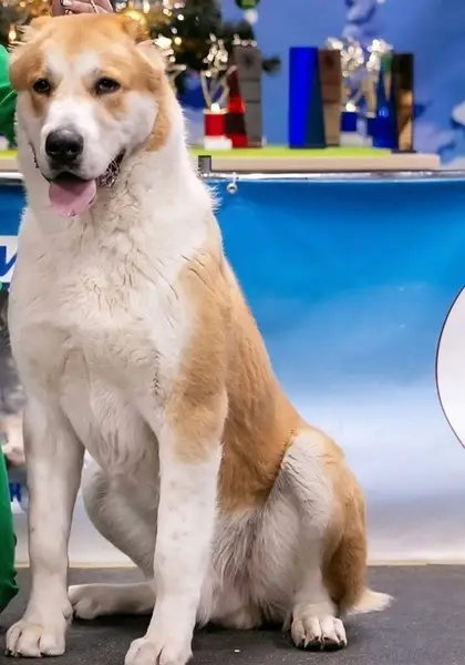 Кобель. Похоже, алабай. Очень спокойный с ошейником, но худой( давно потерялся, видимо)