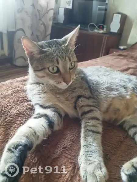 Серый в полоску в общем обычная кошка Все время гуляли на поводке и только во дворе Выбежала из квартиры мы даже не заметили Пропажу обнаружили только вечером Она довольно добрая толстенькая на имя откликается задняя левая лапка повреждена и по этому когда ладится вытягивает ее Большое глаза... Стерелезована...