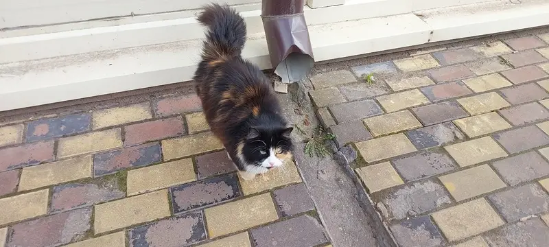 Выбежал на улицу. Куда побежал, непонятно. Очень пушистый и пухлый. При желании может подойти к чужим, но гладиться не даётся. На имя отзывается по своему настроению