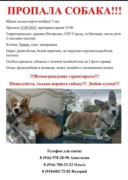 Найдена собака, сука, корги! Братовщина, (Пушкино МО). 19.12. Окрас рыжий с белыми подпалинами, в ошейнике, есть клеймо. Замечена возле Благовещенской церкви, ищем владельца. По паспорту Хэппи Дейс с Жуковки, 23.10.23 Писать в ВК: @id812228746 8(985)147-76-80