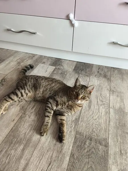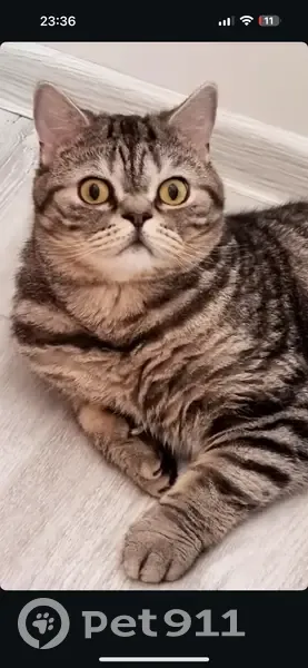 Шотландец. Серый в белую полоску. Пугливый. Чужих не подпустит к себе. Вышел погулять и не вернулся, никогда не уходил дальше ограды. Всегда рядом с домом.