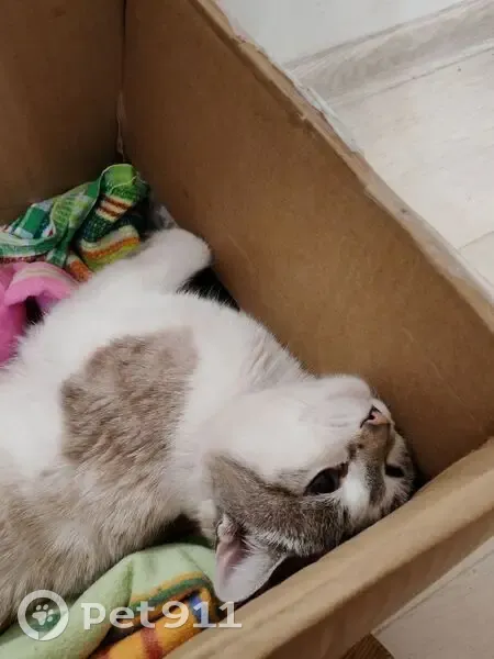 Голубые глазки, белая полоска в форме V перевернутой на лбу, коричневый носик, белое пузо, на лапке пятнышко, спинка коричнево-серая, хвостик чёрно-белый в полоску.