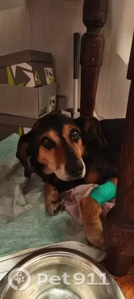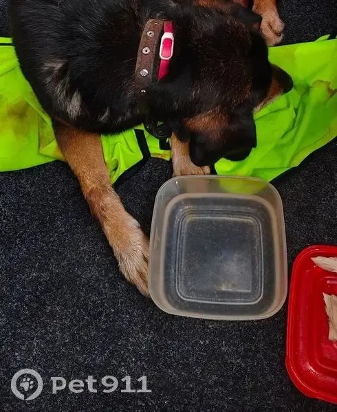 Чёрно-коричневый окрас. На вид от 10 лет. Одето два ошейника. Один ошейник кожаный, коричневого цвета с заклёпками. Второй ошейник красного цвета от блох или клещей.